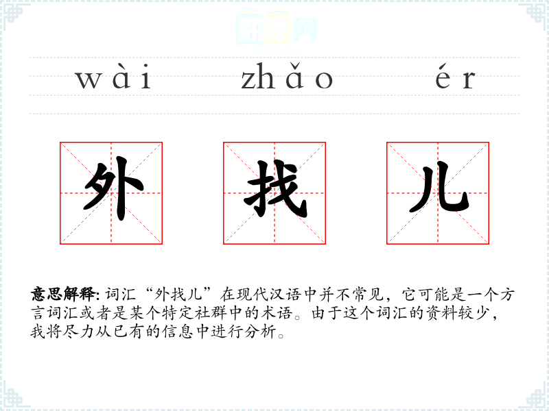 词汇“外找儿”在现代汉语中并不常见,它可能是一个方言词汇或者是某个特定社群中的术语。由于这个词汇的资料较少,我将尽力从已有的信息中进行分析。