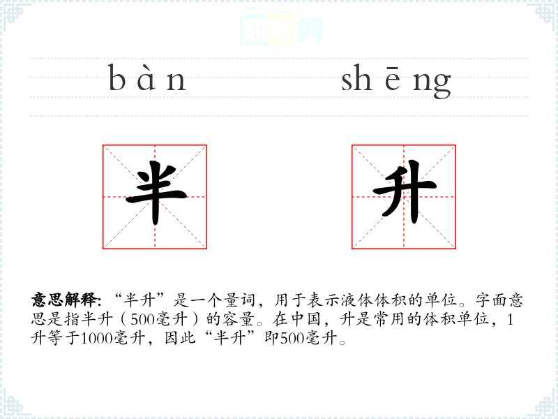“半升”是一个量词,用于表示液体体积的单位。字面意思是指半升(500毫升)的容量。在**,升是常用的体积单位,1升等于1000毫升,因此“半升”即500毫升。