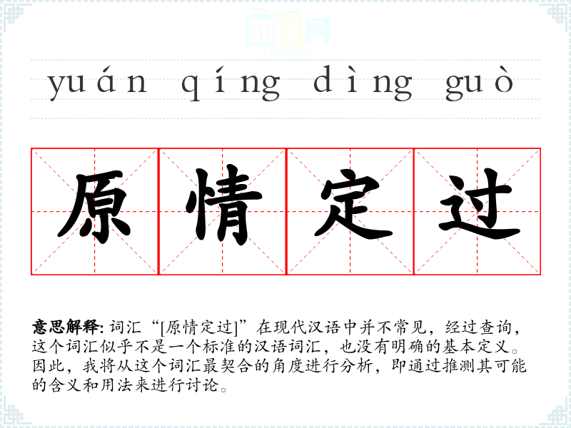 词汇“[原情定过]”在现代汉语中并不常见,经过查询,这个词汇似乎不是一个标准的汉语词汇,也没有明确的基本定义。因此,我将从这个词汇最契合的角度进行分析,即通过推测其可能的含义和用法来进行讨论。