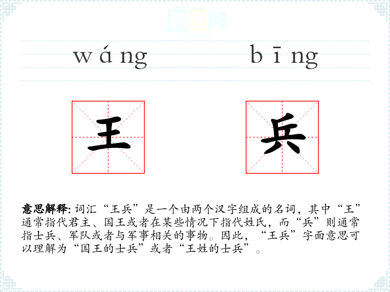 词汇“王兵”是一个由两个汉字组成的名词,其中“王”通常指代君主、国王或者在某些情况下指代姓氏,而“兵”则通常指士兵、军队或者与军事相关的事物。因此,“王兵”字面意思可以理解为“国王的士兵”或者“王姓的士兵”。