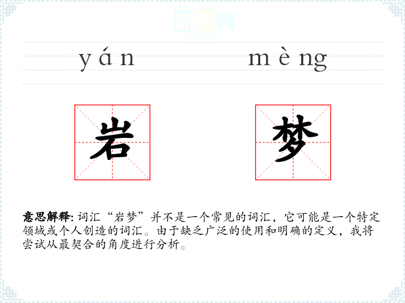 “岩梦”字面意思可以理解为“岩石的梦”或“与岩石相关的梦”。它可能指的是一种与岩石或地质现象相关的梦境,或者是一种比喻性的表达,用以描述与岩石一样坚硬或不可改变的事物。
