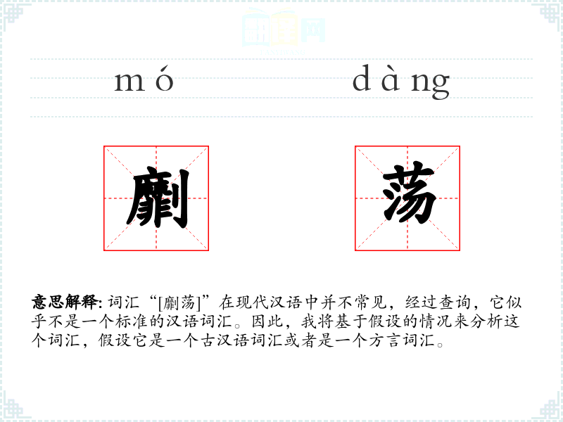 词汇“[劘荡]”在现代汉语中并不常见,经过查询,它似乎不是一个标准的汉语词汇。因此,我将基于假设的情况来分析这个词汇,假设它是一个古汉语词汇或者是一个方言词汇。