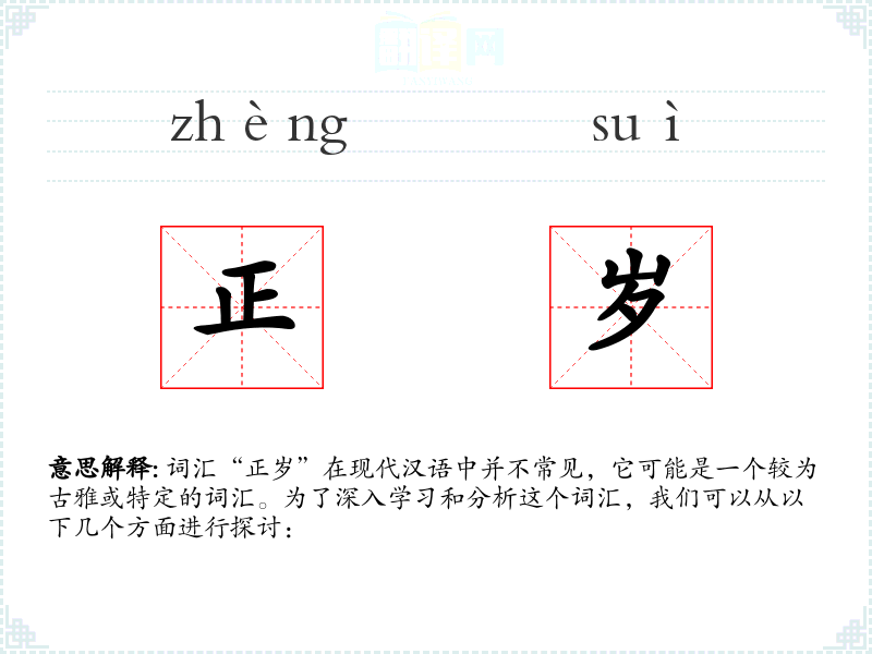 词汇“正岁”在现代汉语中并不常见,它可能是一个较为古雅或特定的词汇。为了深入学*和分析这个词汇,我们可以从以下几个方面进行探讨: