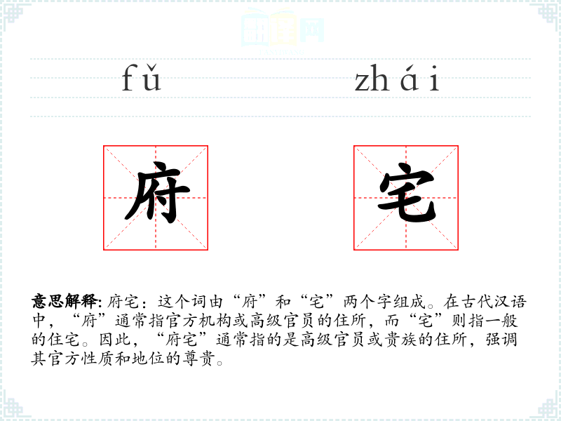 府宅:这个词由“府”和“宅”两个字组成。在古代汉语中,“府”通常指官方机构或高级官员的住所,而“宅”则指一般的住宅。因此,“府宅”通常指的是高级官员或贵族的住所,强调其官方性质和地位的尊贵。