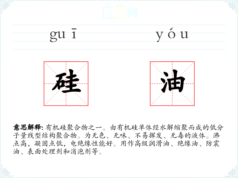 有机硅聚合物之一。由有机硅单体经水解缩聚而成的低分子量线型结构聚合物。为无色、无味、不易挥发、无毒的液体。沸点高,凝固点低,电绝缘性能好。用作高级润滑油、绝缘油、防震油、表面处理剂和消泡剂等。