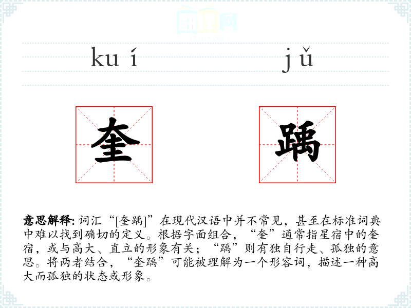 词汇“[奎踽]”在现代汉语中并不常见,甚至在标准词典中难以找到确切的定义。根据字面组合,“奎”通常指星宿中的奎宿,或与高大、直立的形象有关;“踽”则有独自行走、孤独的意思。将两者结合,“奎踽”可能被理解为一个形容词,描述一种高大而孤独的状态或形象。