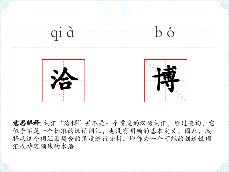 由于“洽博”不是一个标准词汇,我们无法给出确切的基本定义。它可能是某个特定领域或方言中的词汇,或者是某个人的创造性用法。