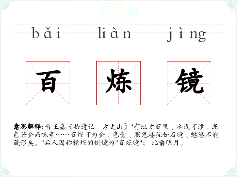 晋王嘉《拾遗记.方丈山》"有池方百里﹐水浅可涉﹐泥色若金而味辛……百炼可为金﹐色青﹐照鬼魅犹如石镜﹐魑魅不能藏形矣。"后人因称精炼的铜镜为"百炼镜"; 比喻明月。