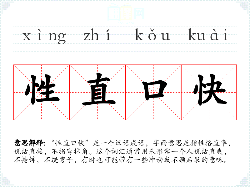 “性直口快”是一个汉语成语,字面意思是指性格直率,说话直接,不拐弯抹角。这个词汇通常用来形容一个人说话直爽,不掩饰,不绕弯子,有时也可能带有一些冲动或不顾后果的意味。