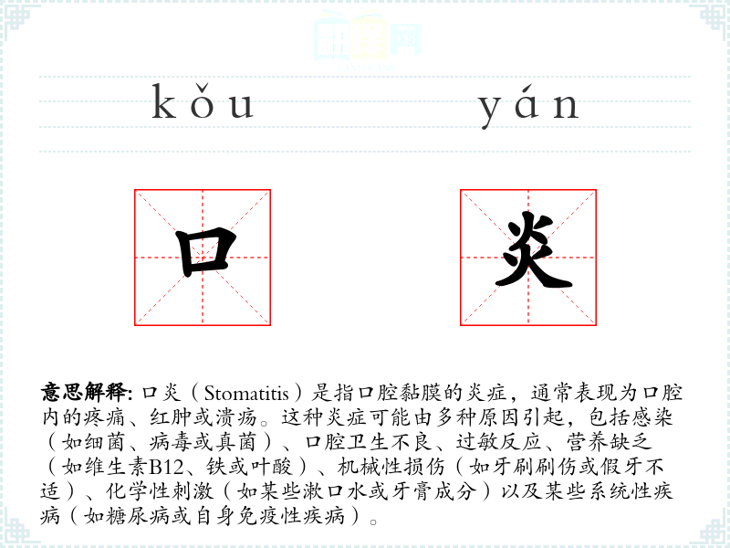- 理解:口炎是一个涉及口腔健康的医学术语,其治疗和管理需要专业的医疗知识和良好的生活习惯。