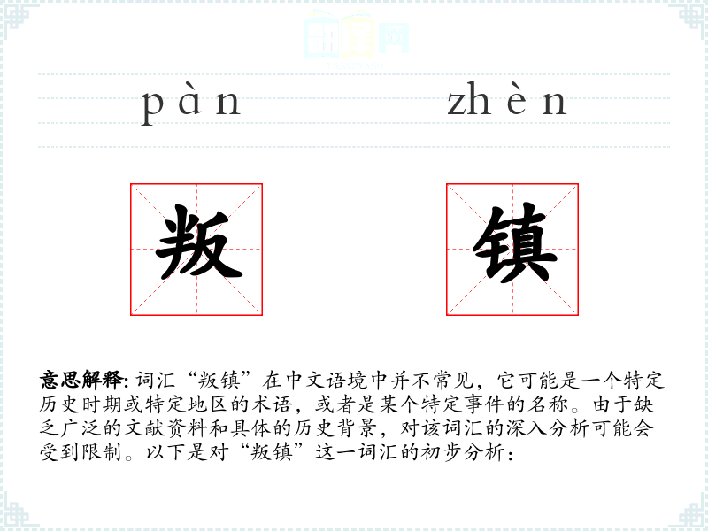 由于“叛镇”不是一个广泛使用的词汇,它在不同语境下的使用可能非常有限。在历史文献或特定地区的方志中可能会提及,用以描述某个特定时期发生的叛乱**。
