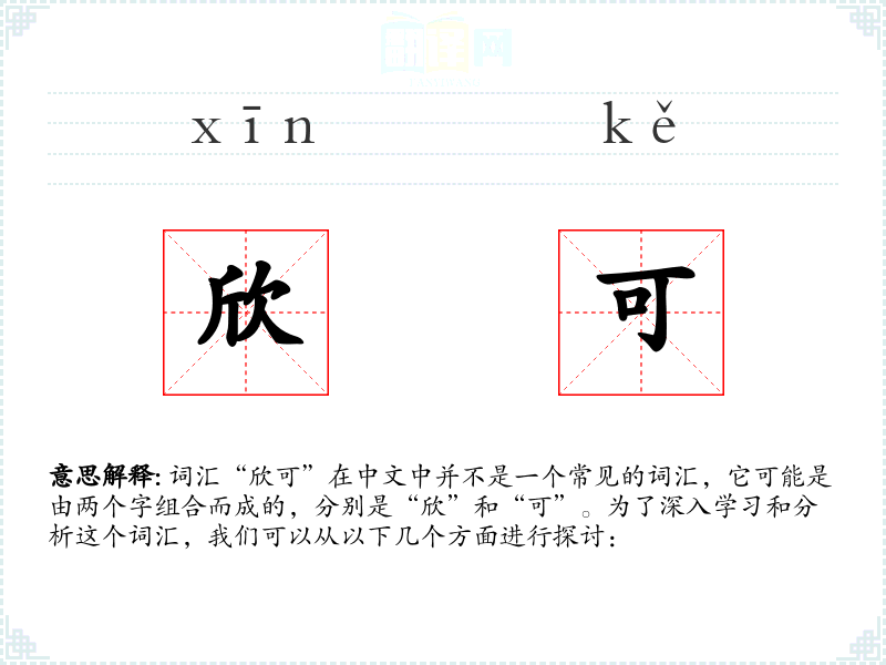 词汇“欣可”在中文中并不是一个常见的词汇,它可能是由两个字组合而成的,分别是“欣”和“可”。为了深入学习和分析这个词汇,我们可以从以下几个方面进行探讨: