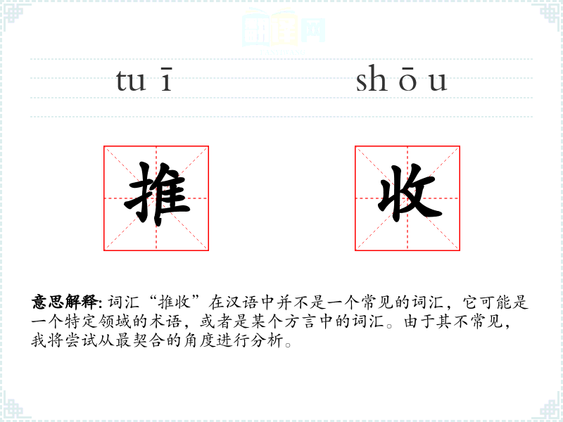 词汇“推收”在汉语中并不是一个常见的词汇,它可能是一个特定领域的术语,或者是某个方言中的词汇。由于其不常见,我将尝试从最契合的角度进行分析。