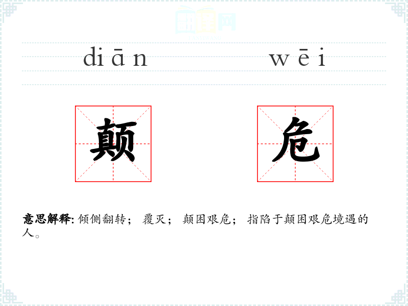 倾侧翻转; 覆灭; 颠困艰危; 指陷于颠困艰危境遇的人。