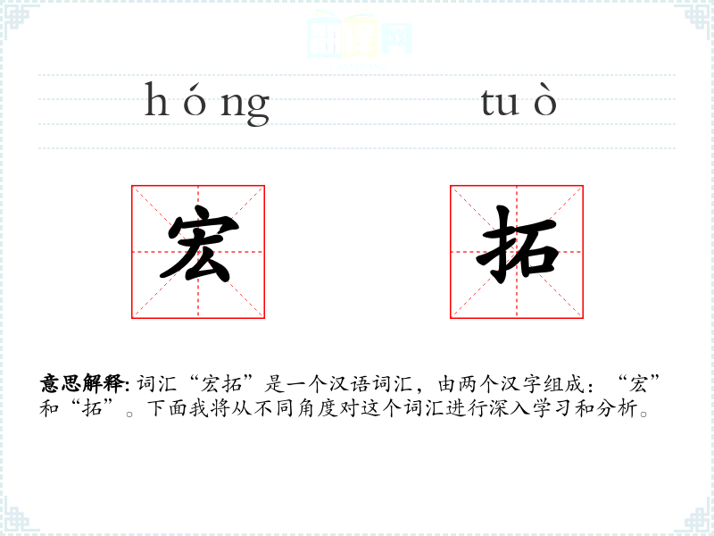 词汇“宏拓”是一个汉语词汇,由两个汉字组成:“宏”和“拓”。下面我将从不同角度对这个词汇进行深入学*和分析。