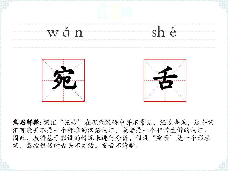 词汇“宛舌”在现代汉语中并不常见,经过查询,这个词汇可能并不是一个标准的汉语词汇,或者是一个非常生僻的词汇。因此,我将基于假设的情况来进行分析,假设“宛舌”是一个形容词,意指说话时舌头不灵活,发音不清晰。
