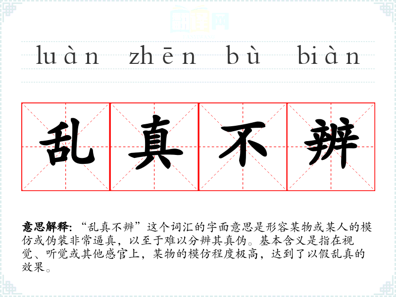 “乱真不辨”这个词汇的字面意思是形容某物或某人的模仿或伪装非常逼真,以至于难以分辨其真伪。基本含义是指在视觉、听觉或其他感官上,某物的模仿程度极高,达到了以假乱真的效果。