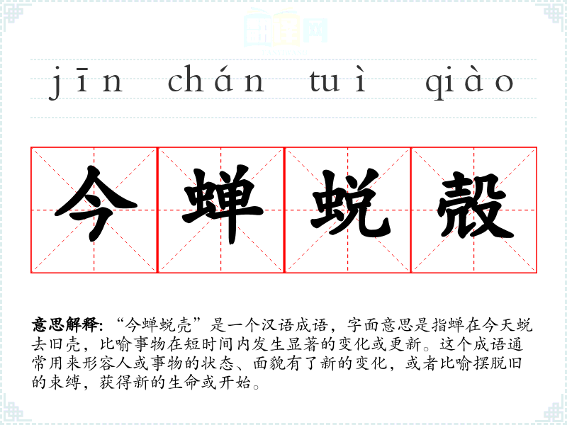 “今蝉蜕壳”是一个汉语成语,字面意思是指蝉在今天蜕去旧壳,比喻事物在短时间内发生显著的变化或更新。这个成语通常用来形容人或事物的状态、面貌有了新的变化,或者比喻摆脱旧的束缚,获得新的生命或开始。
