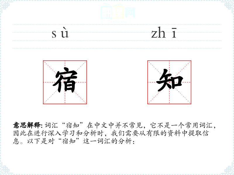 在传统文化中,“宿知”可能与预言、先知等概念相关联,但在现代社会中,这个词汇的使用非常有限,可能只在特定的文学作品或历史文献中出现。