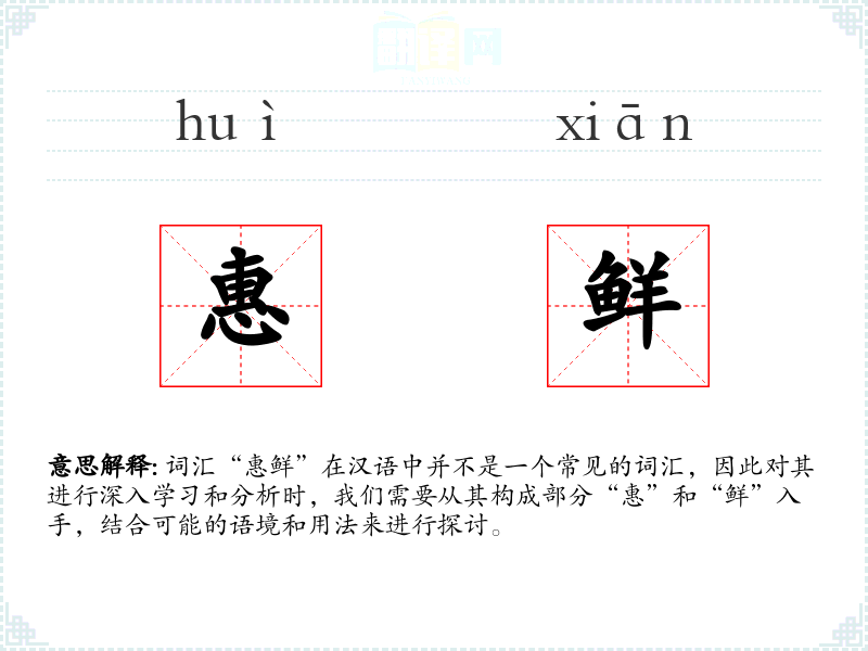 词汇“惠鲜”在汉语中并不是一个常见的词汇,因此对其进行深入学*和分析时,我们需要从其构成部分“惠”和“鲜”入手,结合可能的语境和用法来进行探讨。