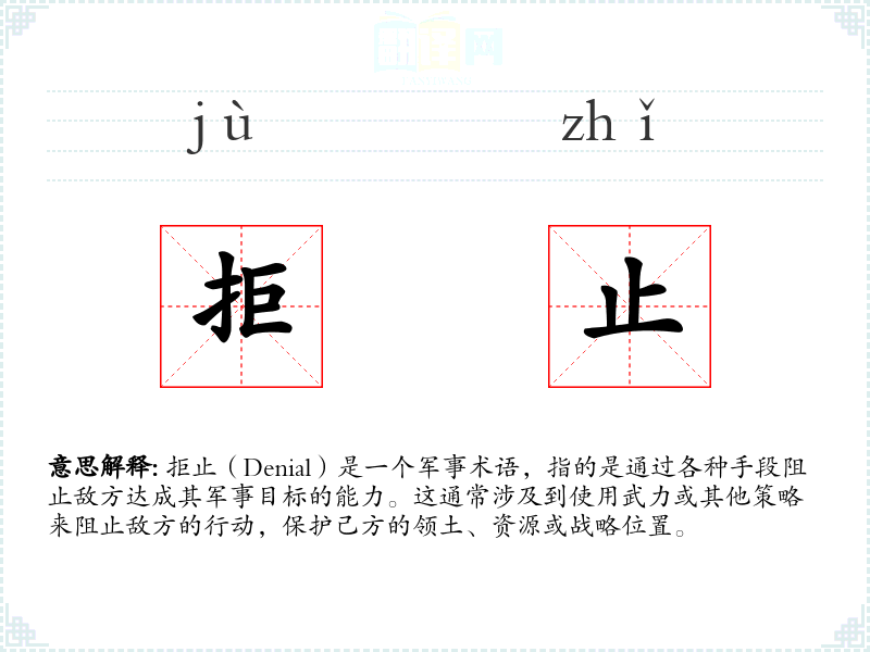 在军事领域,“拒止”通常与“区域拒止”(Area Denial)和“反介入”(Anti-Access)策略相关联,这些策略旨在限制敌方在特定区域的行动自由。在文学和口语中,“拒止”也可以用来描述任何形式的拒绝或阻止行为,不限于军事领域。