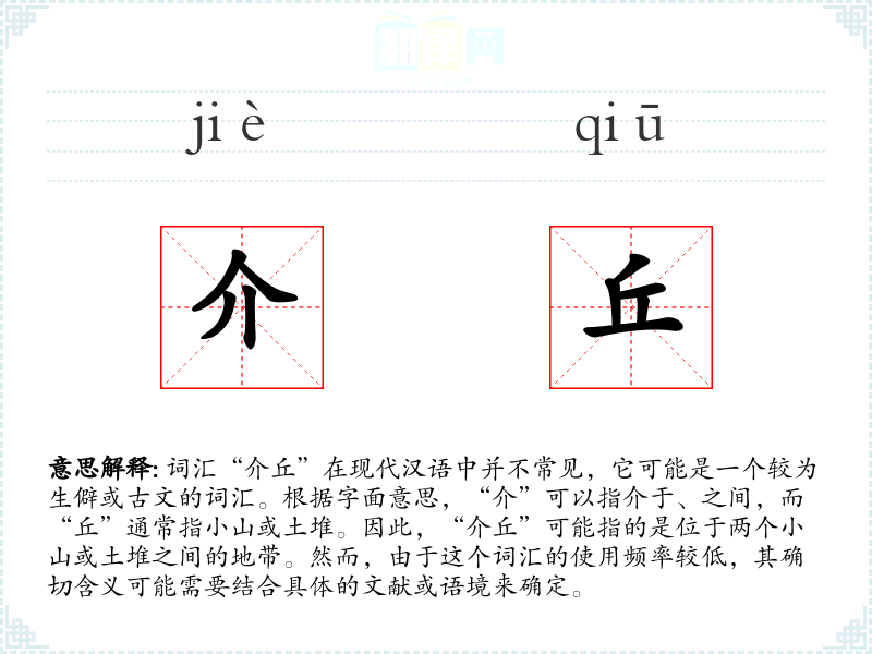 - 理解:“介丘”是一个具有特定地理和文化含义的词汇,虽然在现代汉语中不常见,但在文学和地理学中仍有其价值。