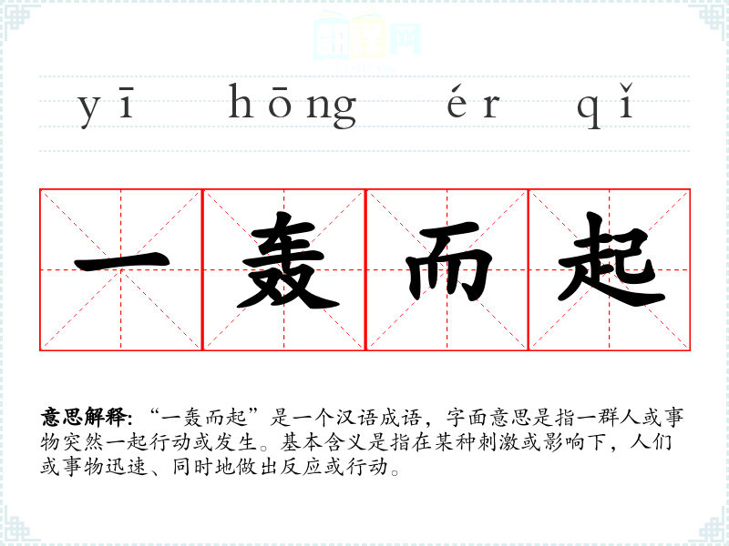 “一轰而起”是一个汉语成语,字面意思是指一群人或事物突然一起行动或发生。基本含义是指在某种刺激或影响下,人们或事物迅速、同时地做出反应或行动。
