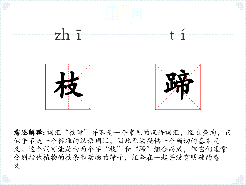 总结来说,词汇“枝蹄”不是一个标准的汉语词汇,因此在语言学习和表达中的应用非常有限。如果遇到这个词,可能需要具体的上下文来理解其意义。
