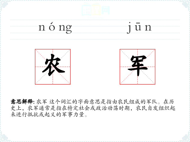 农军这个词汇不仅是一个历史概念,也是一个文化符号,它反映了社会底层人民的斗争和反抗。在语言学*和表达中,理解和运用这个词汇可以帮助我们更好地把握历史脉络,以及社会发展的深层动力。