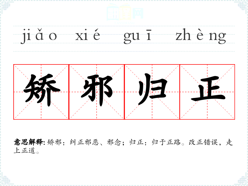 矫邪:纠正邪恶、邪念;归正:归于正路。改正错误,走上正道。