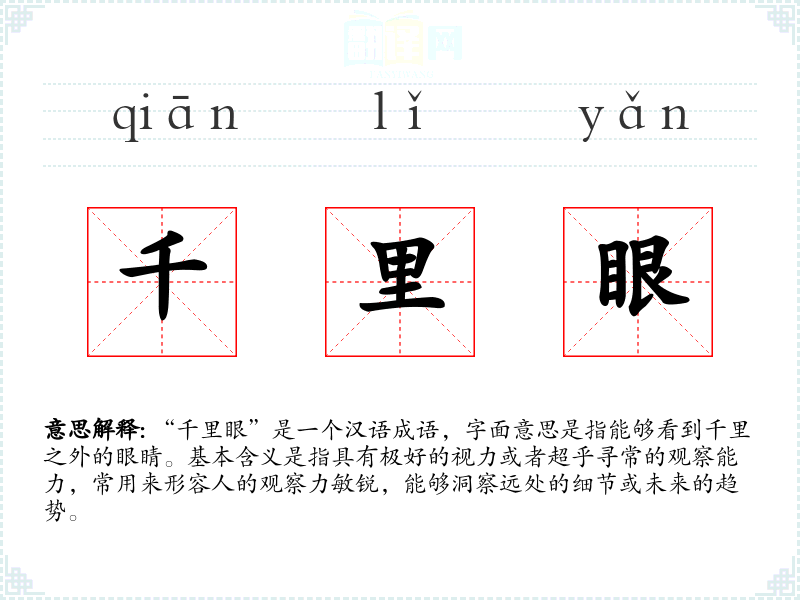 “千里眼”是一个汉语成语,字面意思是指能够看到千里之外的眼睛。基本含义是指具有极好的视力或者超乎寻常的观察能力,常用来形容人的观察力敏锐,能够洞察远处的细节或未来的趋势。
