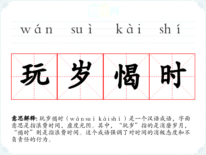 玩岁愒时(wán suì kài shí)是一个汉语成语,字面意思是指浪费时间,虚度光阴。其中,“玩岁”指的是消磨岁月,“愒时”则是指浪费时间。这个成语强调了对时间的消极态度和不负责任的行为。