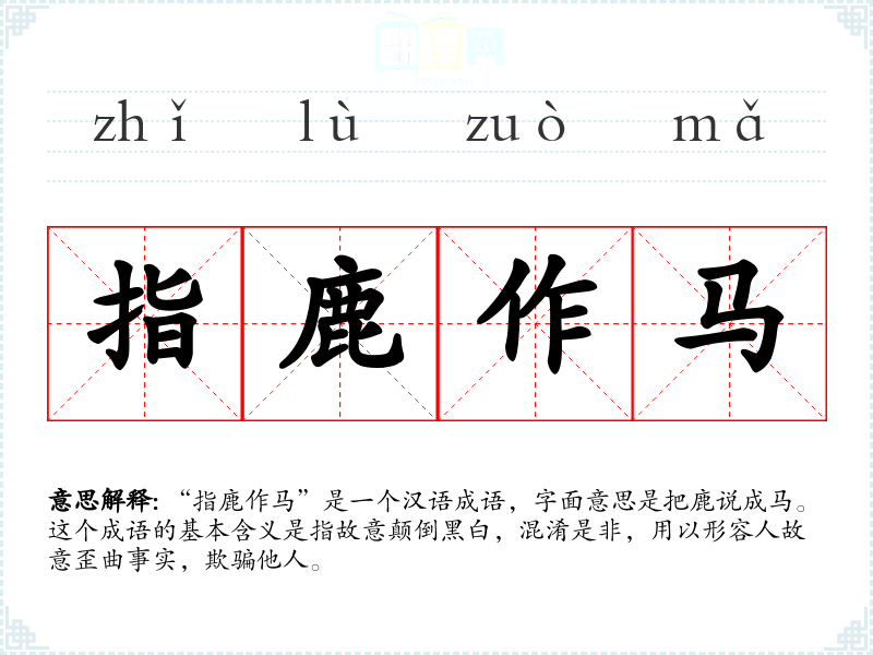 “指鹿作马”是一个汉语成语,字面意思是把鹿说成马。这个成语的基本含义是指故意颠倒黑白,混淆是非,用以形容人故意歪曲事实,欺骗他人。