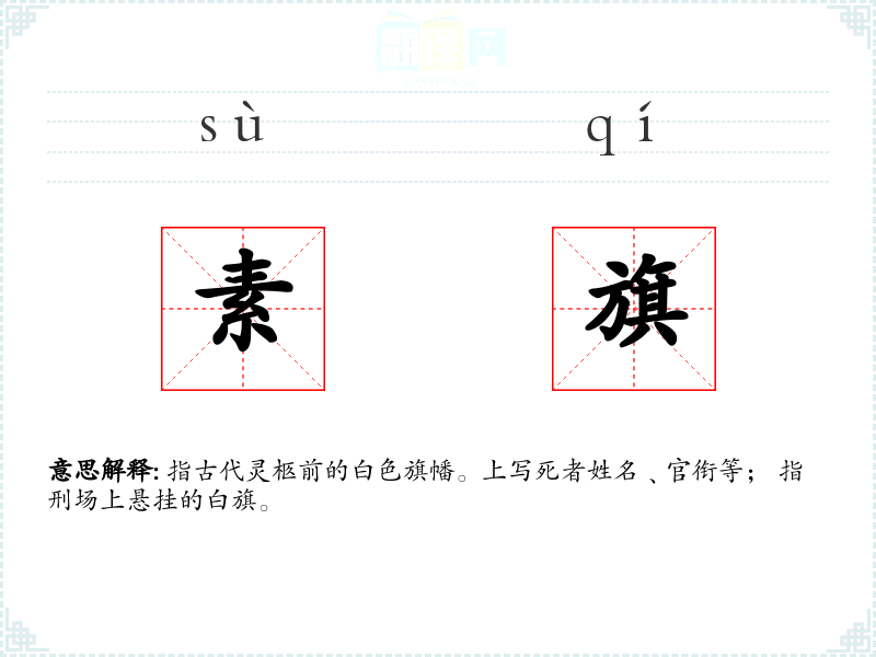 指古代灵柩前的白色旗幡。上写死者姓名﹑官衔等; 指刑场上悬挂的白旗。