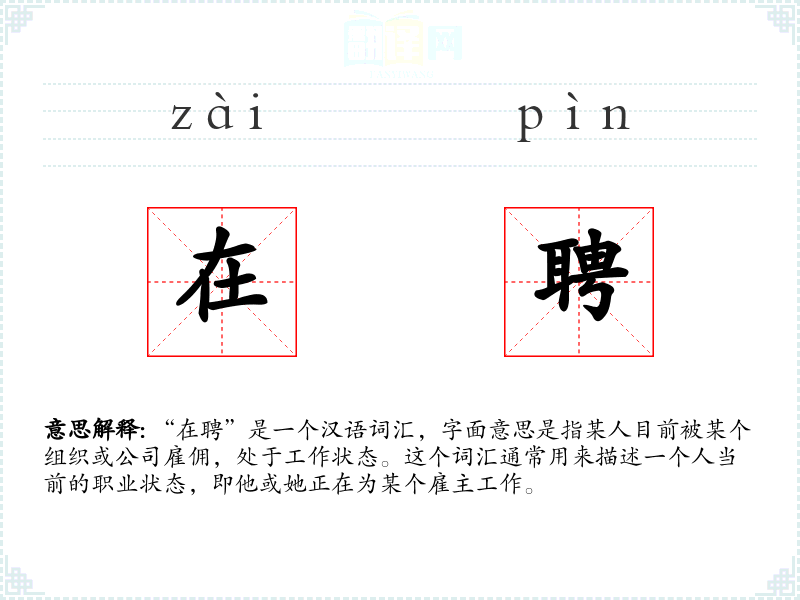 “在聘”这个词汇的词源较为直接,由“在”和“聘”两个字组成。其中,“在”表示存在或状态,“聘”表示聘请或雇佣。这个词汇在现代汉语中使用较为频繁,尤其是在描述职业状态时。