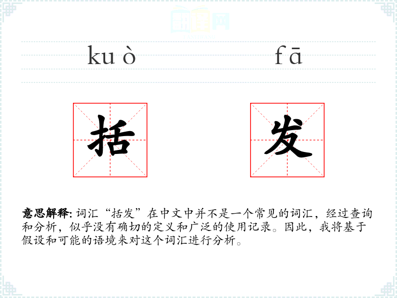 词汇“括发”在中文中并不是一个常见的词汇,经过查询和分析,似乎没有确切的定义和广泛的使用记录。因此,我将基于假设和可能的语境来对这个词汇进行分析。
