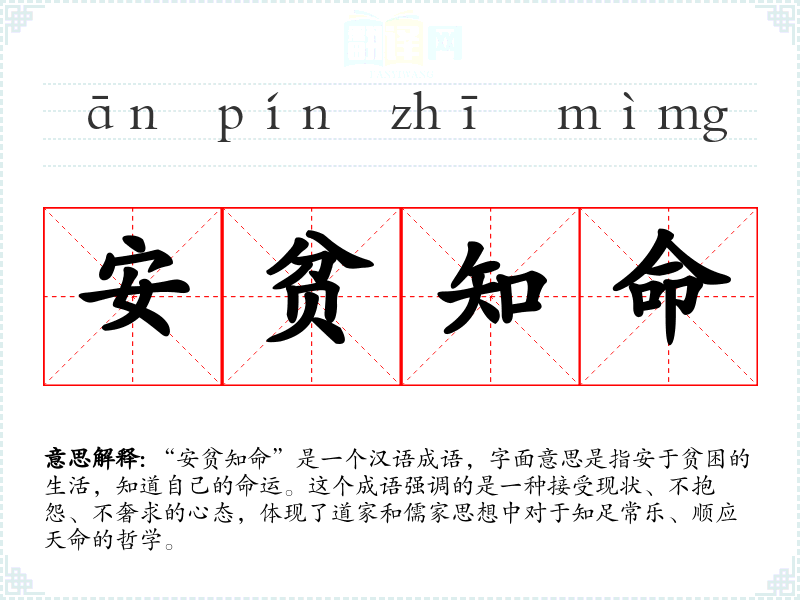 “安贫知命”是一个汉语成语,字面意思是指安于贫困的生活,知道自己的命运。这个成语强调的是一种接受现状、不抱怨、不奢求的心态,体现了道家和儒家思想中对于知足常乐、顺应天命的哲学。