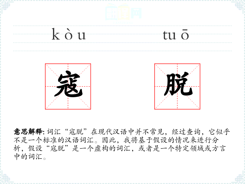 词汇“寇脱”在现代汉语中并不常见,经过查询,它似乎不是一个标准的汉语词汇。因此,我将基于假设的情况来进行分析,假设“寇脱”是一个虚构的词汇,或者是一个特定领域或方言中的词汇。