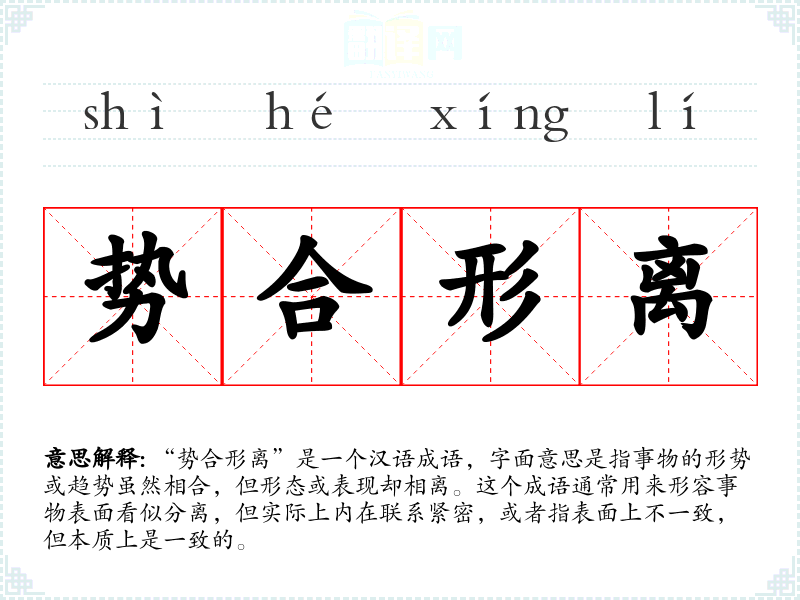 “势合形离”这个成语的词源较为模糊,但它反映了汉语中对于事物内在联系与外在表现差异的深刻理解。随着时间的推移,这个成语的使用逐渐固定,成为描述复杂关系的一个常用表达。