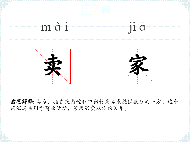 - 反义词:买家、顾客、消费者。这些词汇指代交易中的另一方,即购买商品或服务的人。
