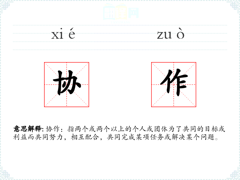 协作:指两个或两个以上的个人或团体为了共同的目标或利益而共同努力,相互配合,共同完成某项任务或解决某个问题。