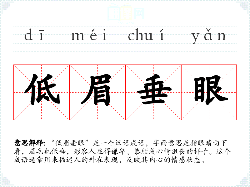 “低眉垂眼”是一个汉语成语,字面意思是指眼睛向下看,眉毛也低垂,形容人显得谦卑、恭顺或心情沮丧的样子。这个成语通常用来描述人的外在表现,反映其内心的情感状态。