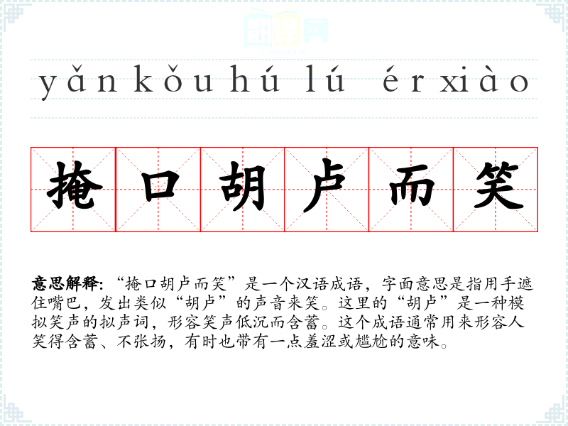 “掩口胡卢而笑”是一个汉语成语,字面意思是指用手遮住嘴巴,发出类似“胡卢”的声音来笑。这里的“胡卢”是一种模拟笑声的拟声词,形容笑声低沉而含蓄。这个成语通常用来形容人笑得含蓄、不张扬,有时也带有一点羞涩或尴尬的意味。