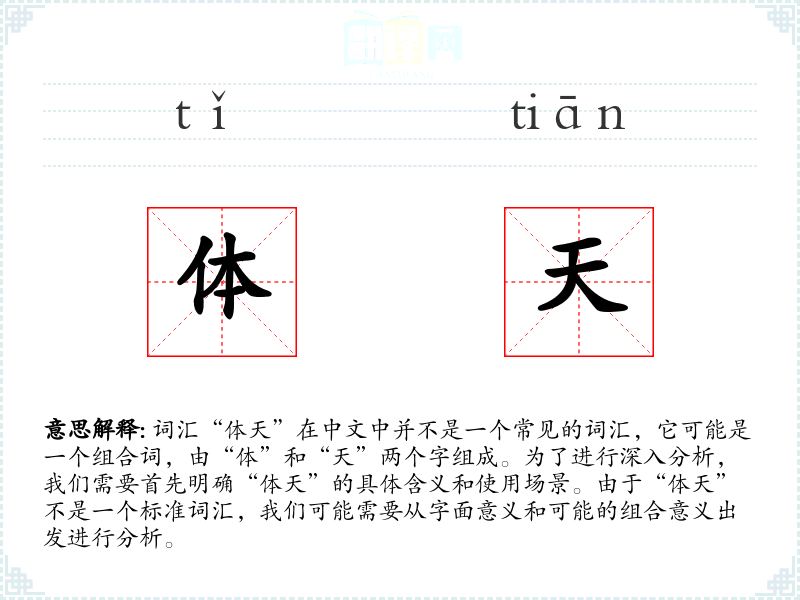 组合起来,“体天”可能指的是与天空或宇宙相关的体验或形态,或者是对天的一种体验或理解。