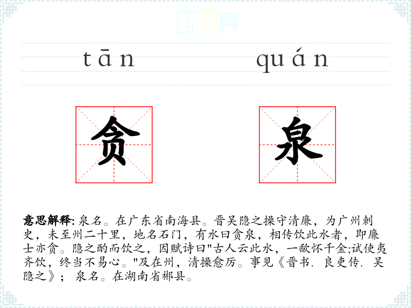 1.泉名。在广东省南海县。晋吴隐之操守清廉,为广州刺史,未至州二十里,地名石门,有水曰贪泉,相传饮此水者,即廉士亦贪。隐之酌而饮之,因赋诗曰"古人云此水,一歃怀千金;试使夷齐饮,终当不易心。"及在州,清操愈厉。事见《晋书.良吏传.吴隐之》; 泉名。在湖南省郴县。