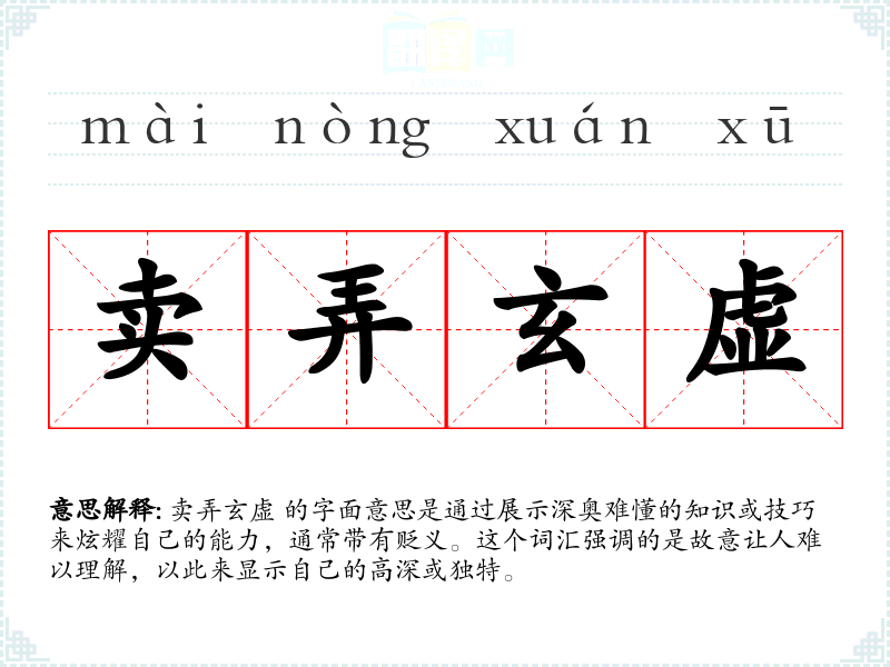 卖弄玄虚 的字面意思是通过展示深奥难懂的知识或技巧来炫耀自己的能力,通常带有贬义。这个词汇强调的是故意让人难以理解,以此来显示自己的高深或独特。