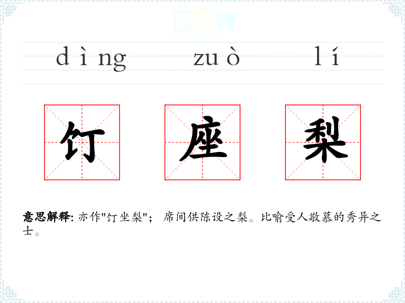 亦作"饤坐梨"; 席间供陈设之梨。比喻受人敬慕的秀异之士。