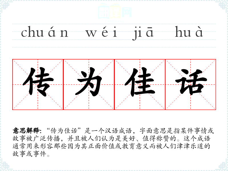 “传为佳话”是一个汉语成语,字面意思是指某件事情或故事被广泛传播,并且被人们认为是美好、值得称赞的。这个成语通常用来形容那些因为其正面价值或教育意义而被人们津津乐道的故事或**。