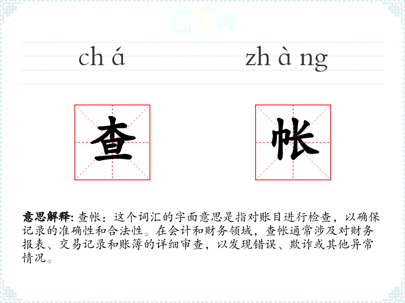 查帐:这个词汇的字面意思是指对账目进行检查,以确保记录的准确性和合法性。在会计和财务领域,查帐通常涉及对财务报表、交易记录和账簿的详细审查,以发现错误、欺诈或其他异常情况。