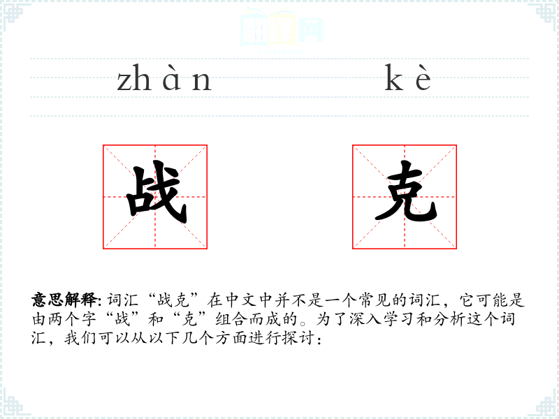词汇“战克”在中文中并不是一个常见的词汇,它可能是由两个字“战”和“克”组合而成的。为了深入学*和分析这个词汇,我们可以从以下几个方面进行探讨: